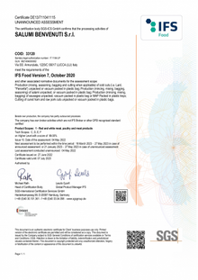 La qualità della dispensa Salumi Benvenuti a primo impatto è sia estetica che gustosa per l'apetto e il sapore suberbo e pregiato della sua vasta selezione, ma soprattuto garantito da certificazioni di qualità ufficiali.
